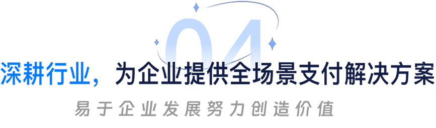 易贝宝积极布局电商、酒店、共享经济、智慧零售、在线教育、国际贸易等行业。针对中小型企业面临的数字化转型、系统化运营等需求,易贝宝以“技术”为核心,以“风控、服务、智库、产品”为驱动,形成四轮同向发力,将科技创新“触角”伸向各个行业,为企业客户打造专业、高效、安全的行业解决方案,助力企业在业务运营中有效优化信息流和资金流效率,提升客户行业竞争力。